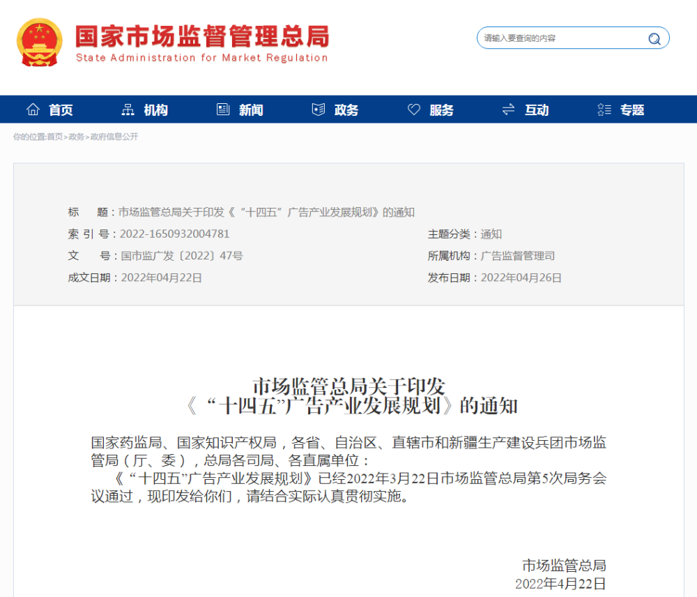 近日,市場監(jiān)管總局印發(fā)《“十四五”廣告產業(yè)發(fā)展規(guī)劃》(以下簡稱《規(guī)劃》),系統(tǒng)謀劃“十四五”時期推動廣告產業(yè)高質量發(fā)展相關工作。